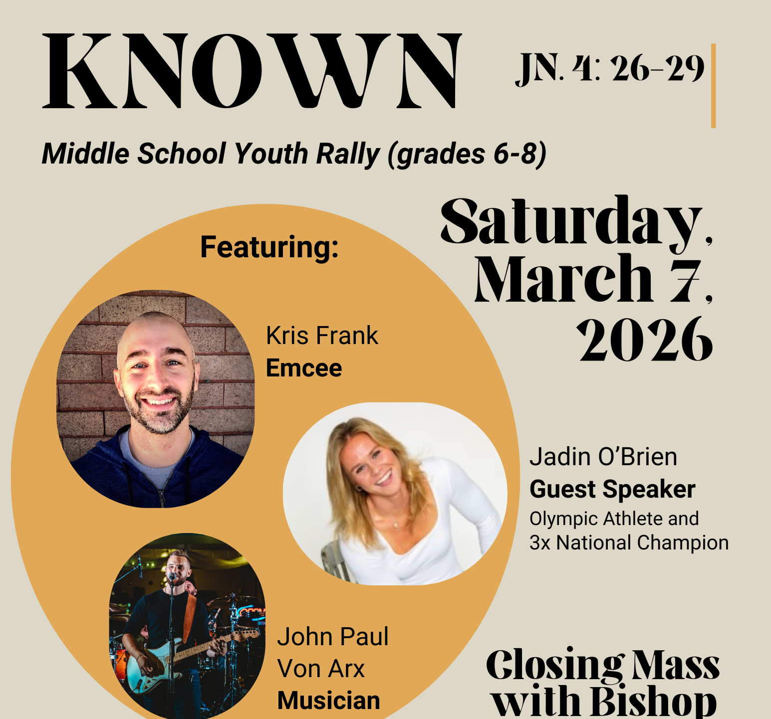Join youth in grades 6-8 for an incredible day filled with music, fun, games and prayer, featuring popular emcee and guest speaker Kris Frank, Jadin O’Brien (3x National Champion and Olympic Athlete) and musician John Paul Von Arx! Youth are invited to register with their parish.
